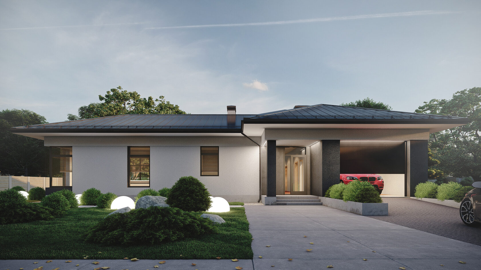 проект, в котором продуман каждый метр. Дом одноэтажный, а это значит, что передвигаться в нем будет безопасно и удобно, особенно пожилым людям и детям. Внутреннее пространство мы традиционно разделили на две зоны - общественную и приватную. Из просторной прихожей мы попадаем в большое открытое пространство кухни-гостиной с высоким скатным потолком. Сразу от входа через панорамные окна просматриваются терраса и участок за домом.