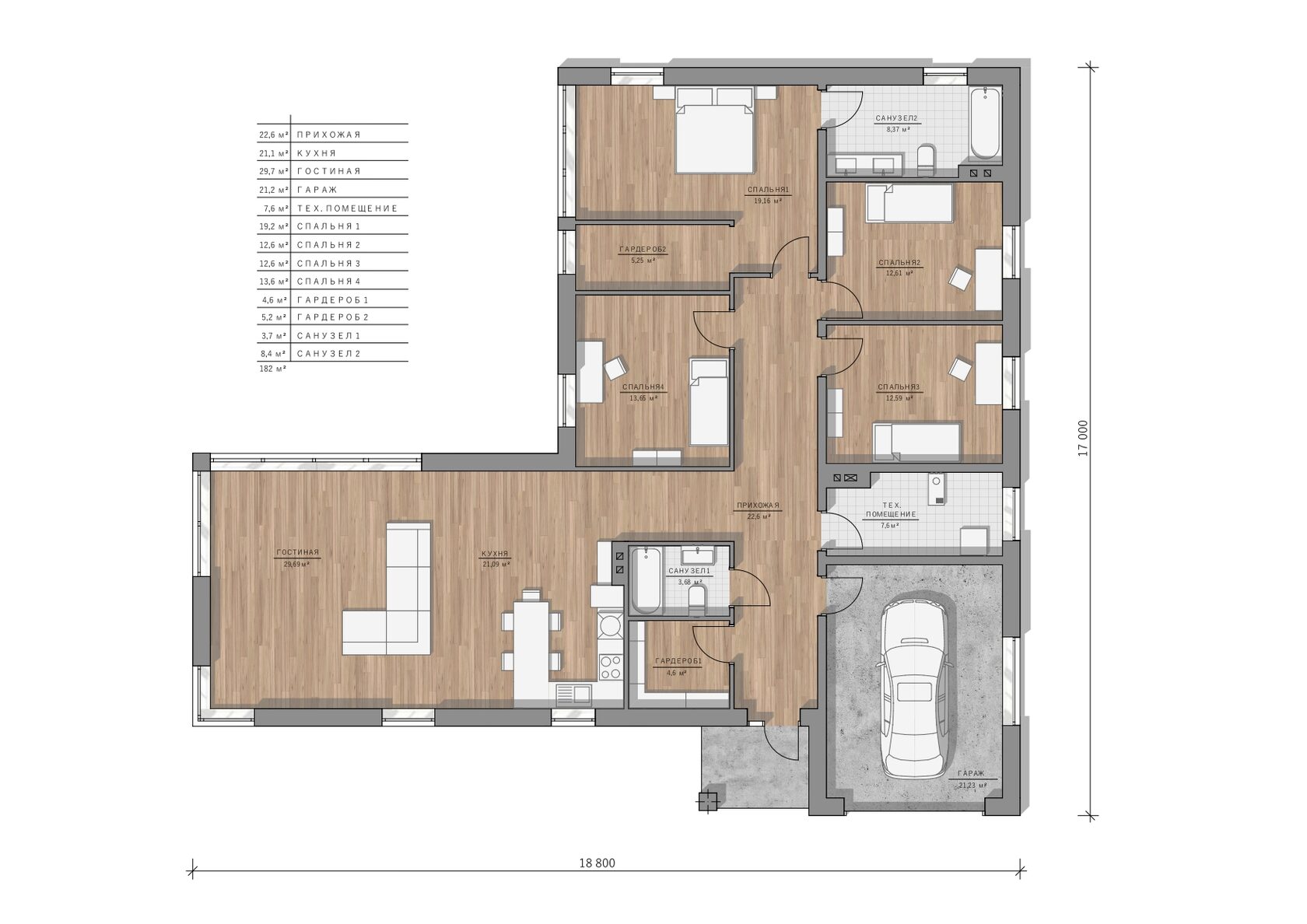 Одноэтажный жилой дом проекта Милино 187 м2 Для кого: большой семьи с детьми, где мастер-спальня отделена от детских комнат и активной зоны. Из чего: фундамент монолитная плита, стены теплая керамика, утепленная фальцевая кровля, премиальные оконные конструкции.